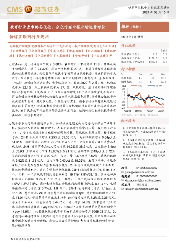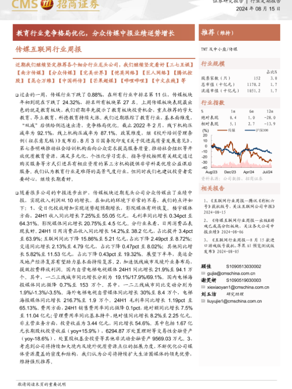 【海通证券】【20240815】20240815-招商证券-传媒互联网行业周报:教育行业竞争格局优化,分众传媒中报业绩逆势增长-12页