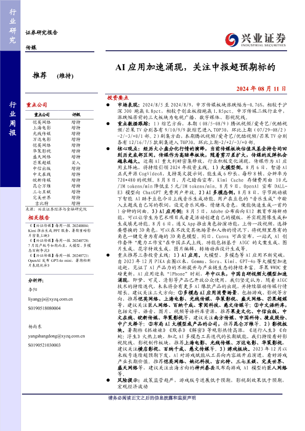 【兴业证券】【20240811】20240811-兴业证券-传媒行业周报:AI应用加速涌现,关注中报超预期标的-14页