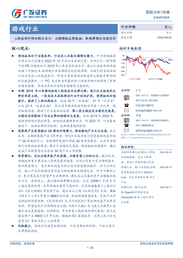 【广发证券】【20240822】游戏行业:三轮底部行情回顾与启示:业绩铸就反弹基础,新趋势催生估值空间-20页