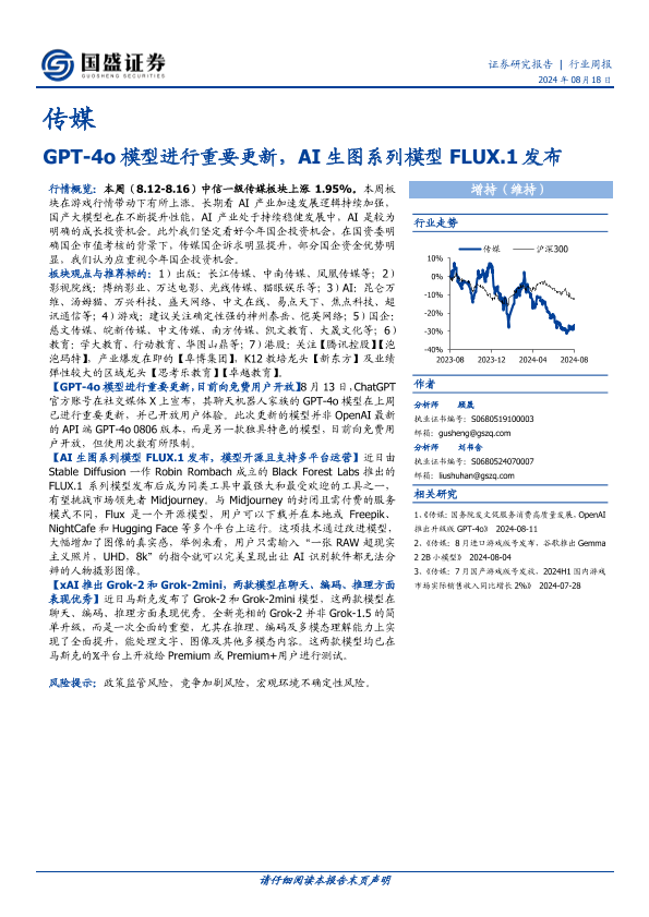 【国盛证券】【20240818】20240818-国盛证券-传媒行业周报:GPT-4o模型进行重要更新,AI生图系列模型FLUX.1发布-10页