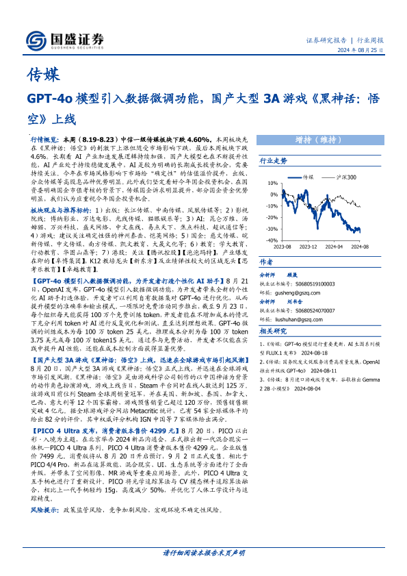 【国盛证券】【20240825】20240825-国盛证券-传媒行业周报:GPT-4o模型引入数据微调功能,国产大型3A游戏《黑神话:悟空》上线-10页
