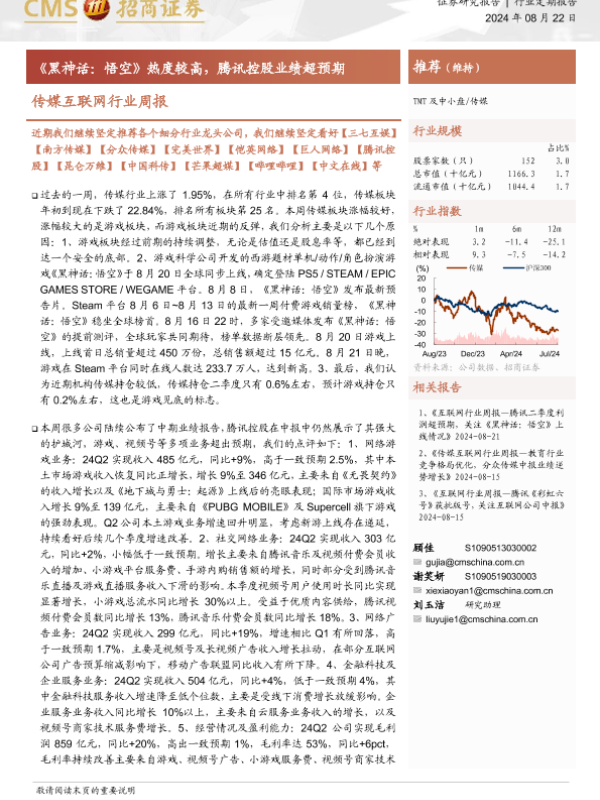 【海通证券】【20240822】20240822-招商证券-传媒互联网行业周报:《黑神话:悟空》热度较高,腾讯控股业绩超预期-12页
