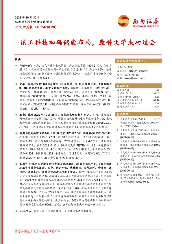【西南证券】【20221030】北交所周报:昆工科技加码储能布局,康普化学成功过会-19页
