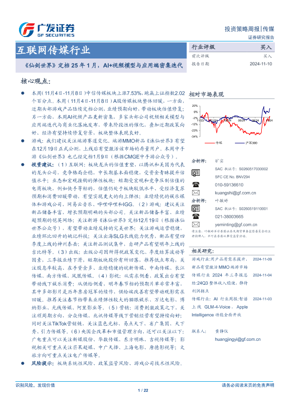 【广发证券】【20241110】20241110-广发证券-互联网传媒行业投资策略周报:《仙剑世界》定档25年1月,AI+视频模型与应用端密集迭代-22页