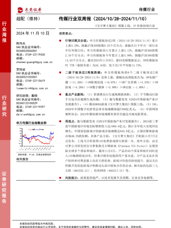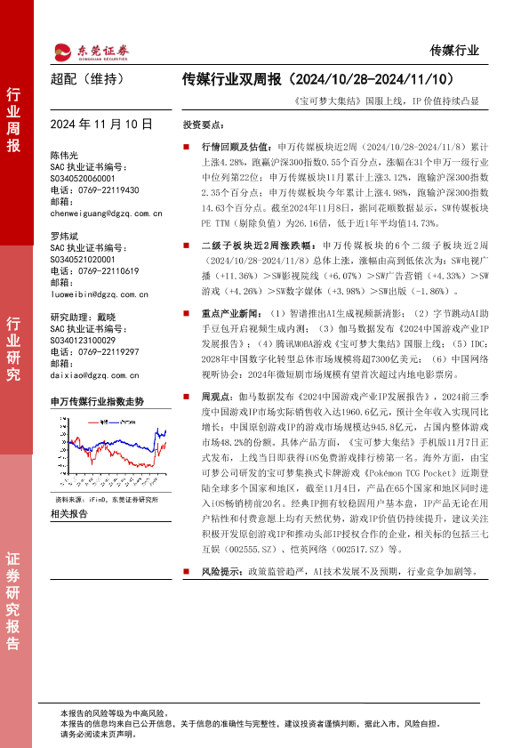 【东莞证券】【20241110】20241110-东莞证券-传媒行业双周报:《宝可梦大集结》国服上线,IP价值持续凸显-12页