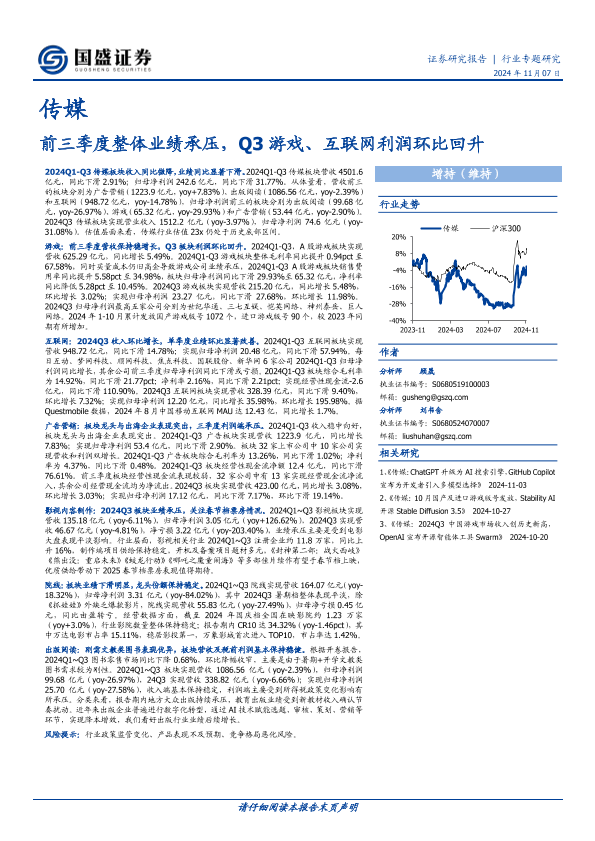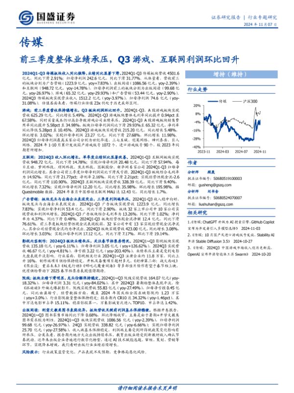 【国盛证券】【20241107】20241107-国盛证券-传媒行业专题研究:前三季度整体业绩承压,Q3游戏、互联网利润环比回升-23页