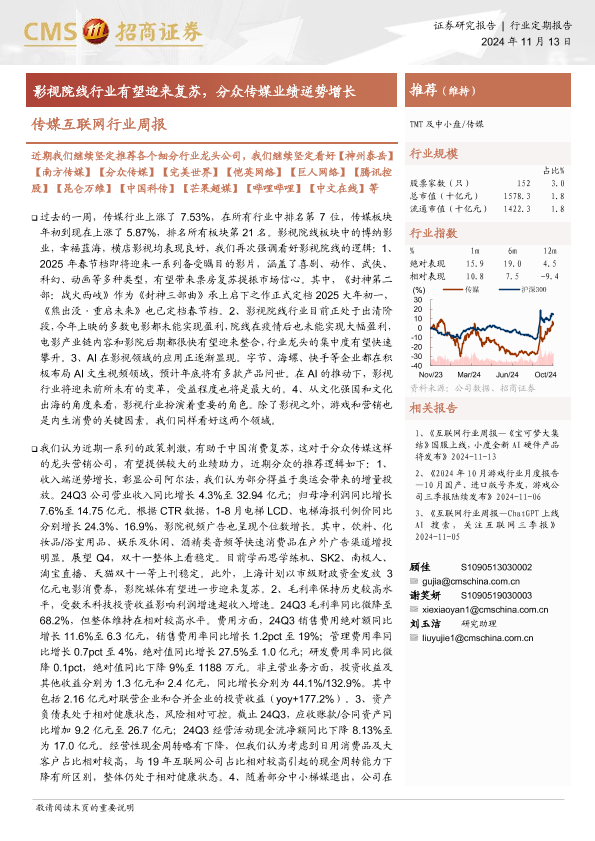 【海通证券】【20241113】20241113-招商证券-传媒互联网行业周报:影视院线行业有望迎来复苏,分众传媒业绩逆势增长-12页