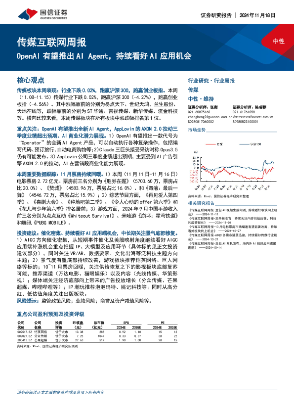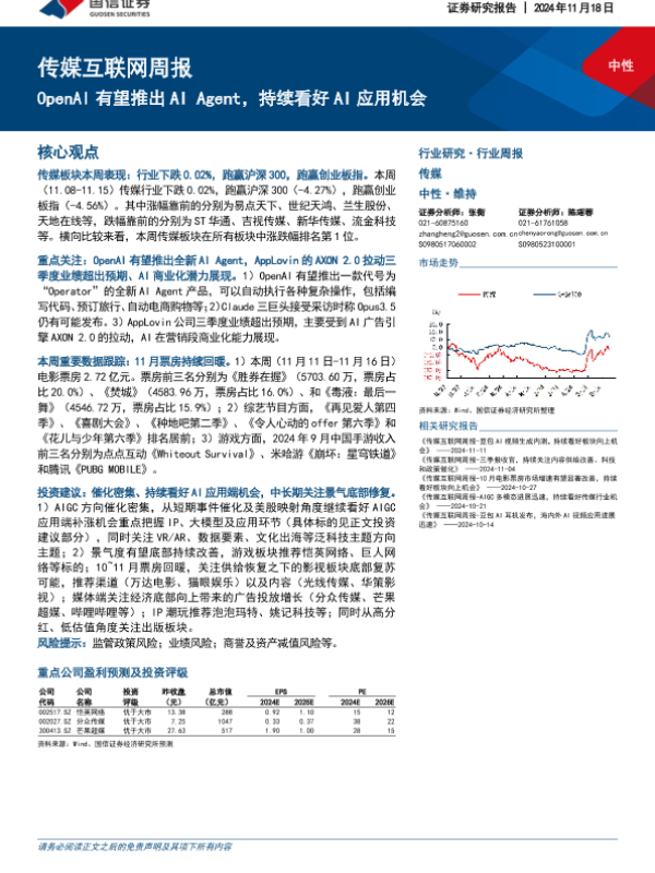【国信证券】【20241118】20241118-国信证券-传媒互联网行业周报:OpenAI有望推出AI Agent,持续看好AI应用机会-13页