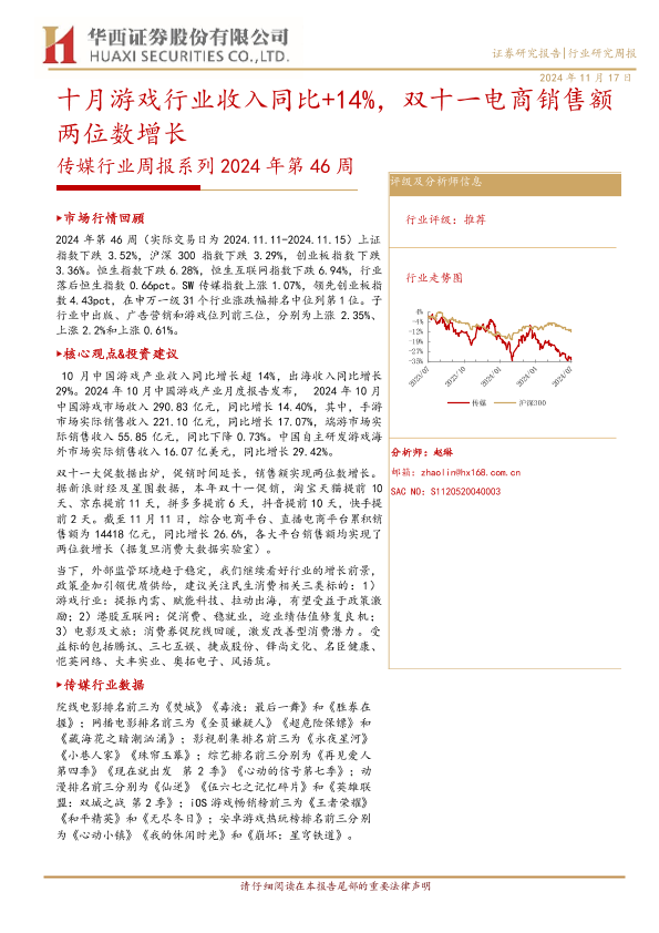【华西证券】【20241117】2024年第46周传媒行业周报:十月游戏行业收入同比+14%,双十一电商销售额两位数增长-25页