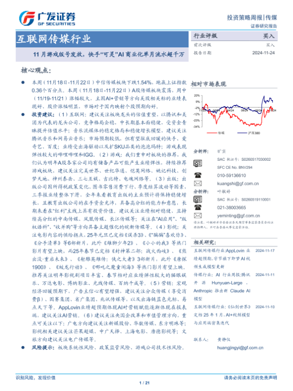 【广发证券】【20241124】20241124-广发证券-互联网传媒行业投资策略周报:11月游戏版号发放,快手“可灵”AI商业化单月流水超千万-21页