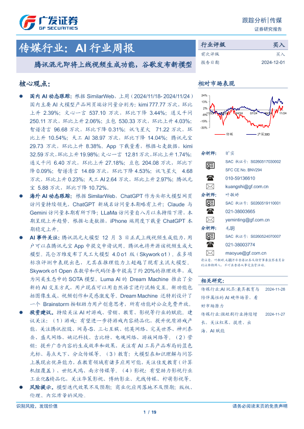 【广发证券】【20241201】传媒行业:AI行业周报,腾讯混元即将上线视频生成功能,谷歌发布新模型-19页