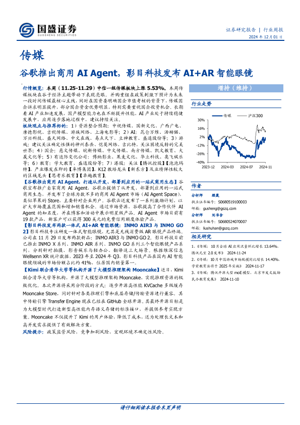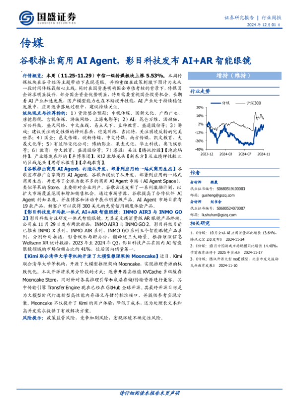 【国盛证券】【20241201】20241201-国盛证券-传媒行业周报:谷歌推出商用AI Agent,影目科技发布AI+AR智能眼镜-11页