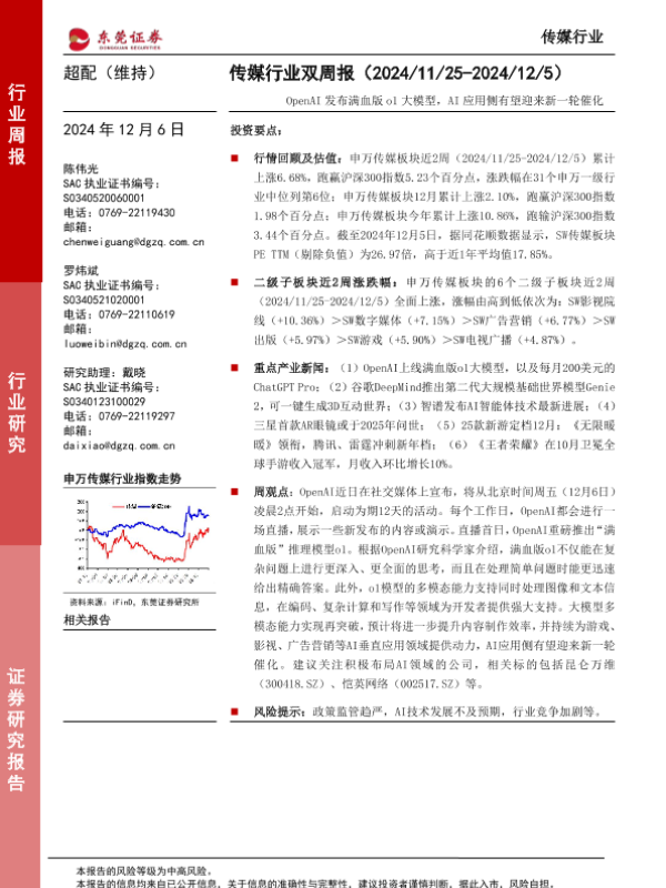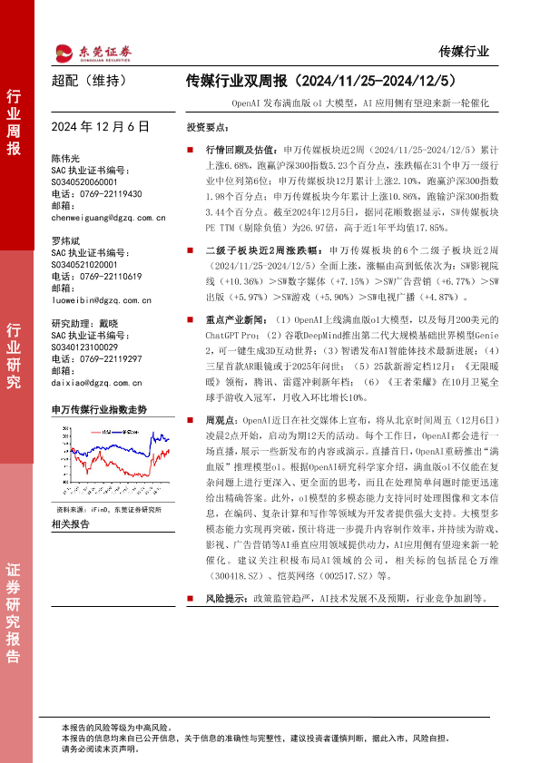 【东莞证券】【20241206】传媒行业双周报:OpenAI发布满血版o1大模型,AI应用侧有望迎来新一轮催化-12页