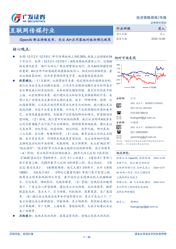 【广发证券】【20241208】互联网传媒行业投资策略周报:OpenAI新品持续发布,关注AI+应用落地对板块催化效果-23页