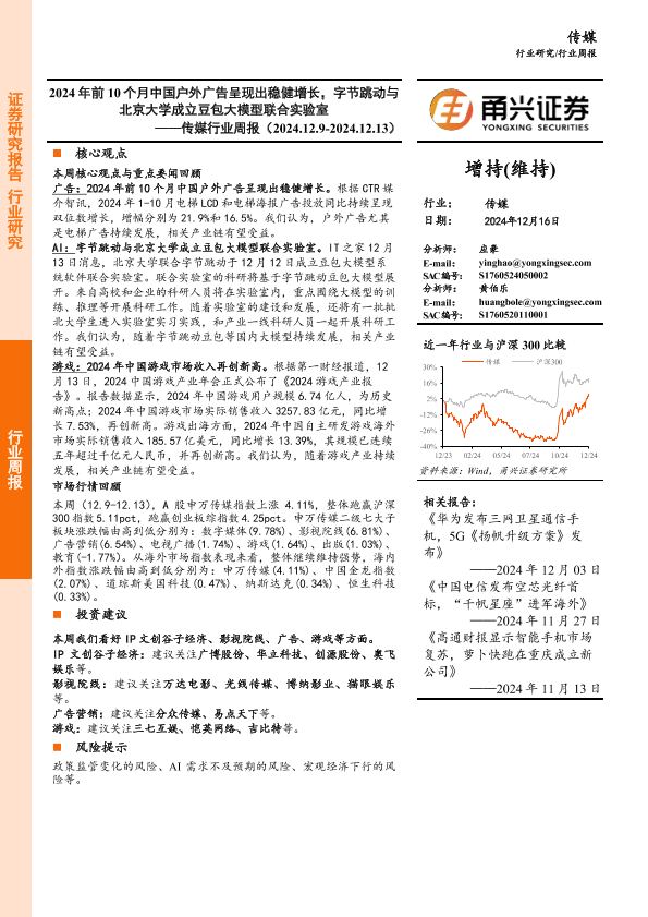 【甬兴证券】【20241216】2024年前10个月中国户外广告呈现出稳健增长,字节跳动与北京大学成立豆包大模型联合实验室-12页