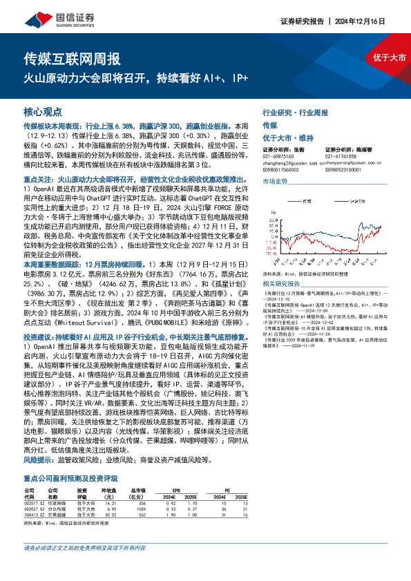 【国信证券】【20241216】20241216-国信证券-传媒互联网行业周报:火山原动力大会即将召开,持续看好AI+、IP+-13页