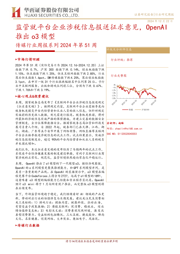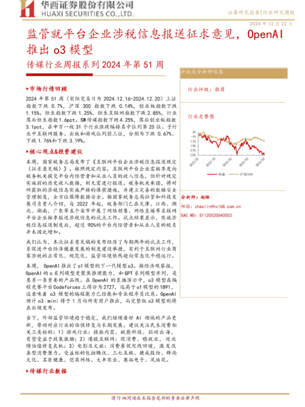 【华西证券】【20241222】2024年第51周传媒行业周报:监管就平台企业涉税信息报送征求意见,OpenAI推出o3模型-28页