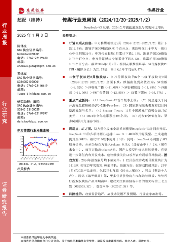 【东莞证券】【20250103】20250103-东莞证券-传媒行业双周报:DeepSeek-V3发布,2024全年获批游戏版号实现同比增长-12页