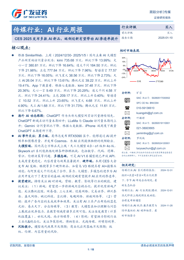 【广发证券】【20250110】传媒行业:AI行业周报,CES 2025发布多款AI新品,端侧创新有望带动AI渗透率提升-18页