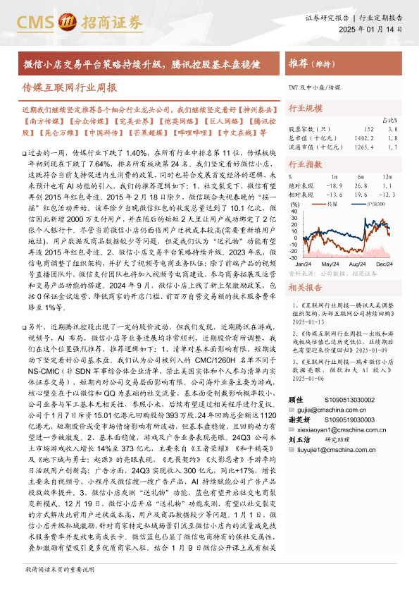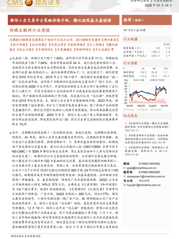 【海通证券】【20250114】20250114-招商证券-传媒互联网行业周报:微信小店交易平台策略持续升级,腾讯控股基本盘稳健-12页