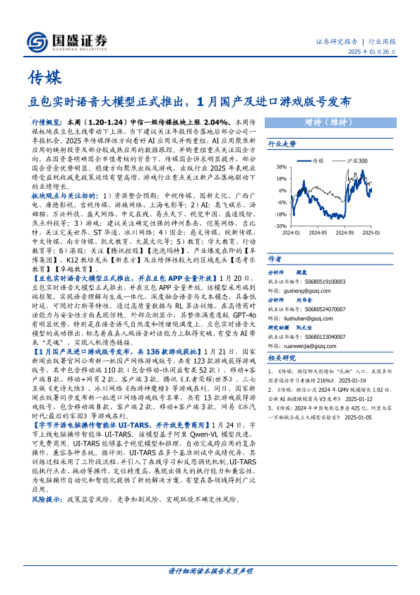 【国盛证券】【20250126】20250126-国盛证券-传媒行业周报:豆包实时语音大模型正式推出,1月国产及进口游戏版号发布-10页