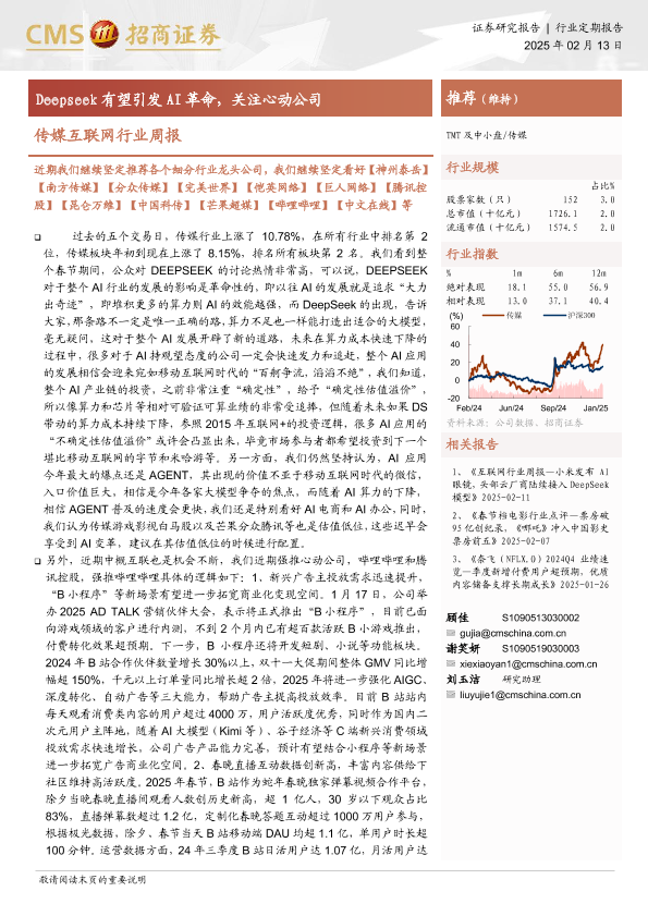 【海通证券】【20250213】20250213-招商证券-传媒互联网行业周报:Deepseek有望引发AI革命,关注心动公司-12页