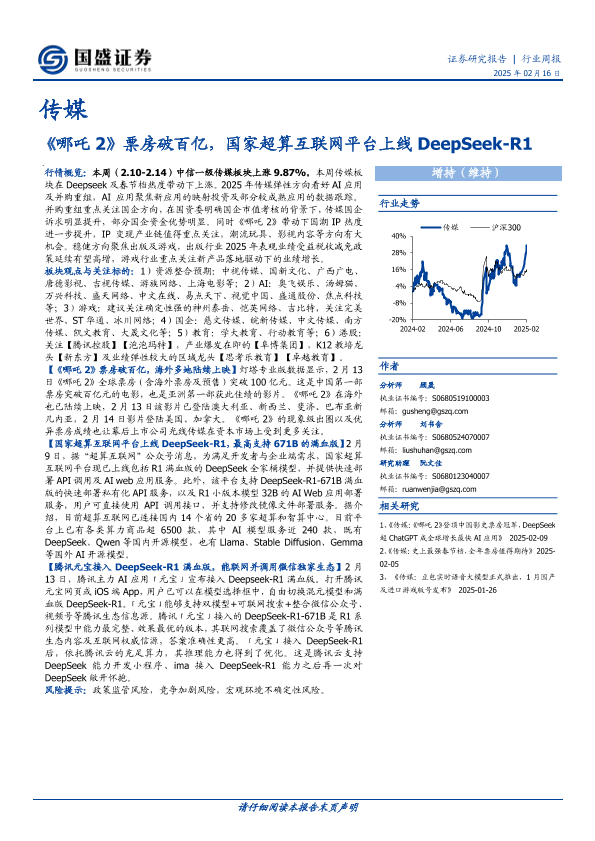 【国盛证券】【20250216】20250216-国盛证券-传媒行业周报:《哪吒2》票房破百亿,国家超算互联网平台上线DeepSeek-R1-10页