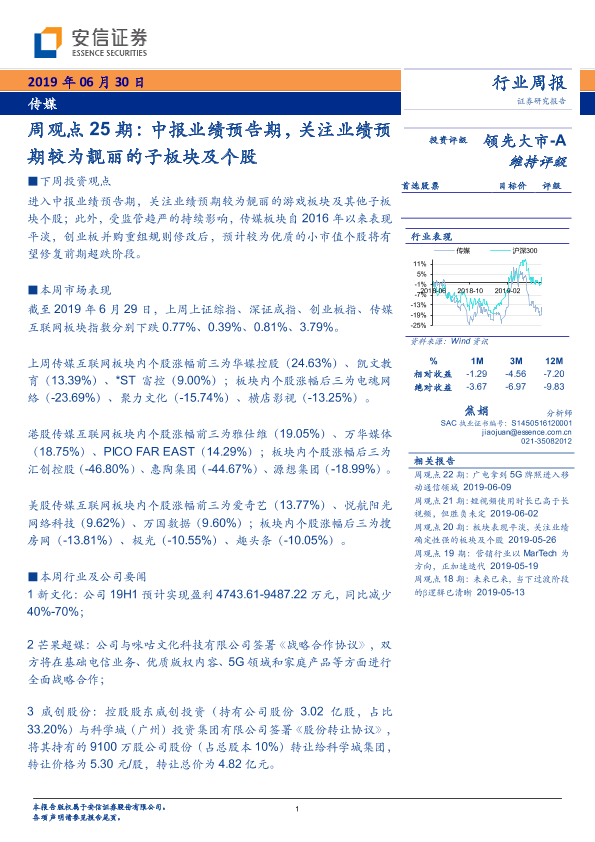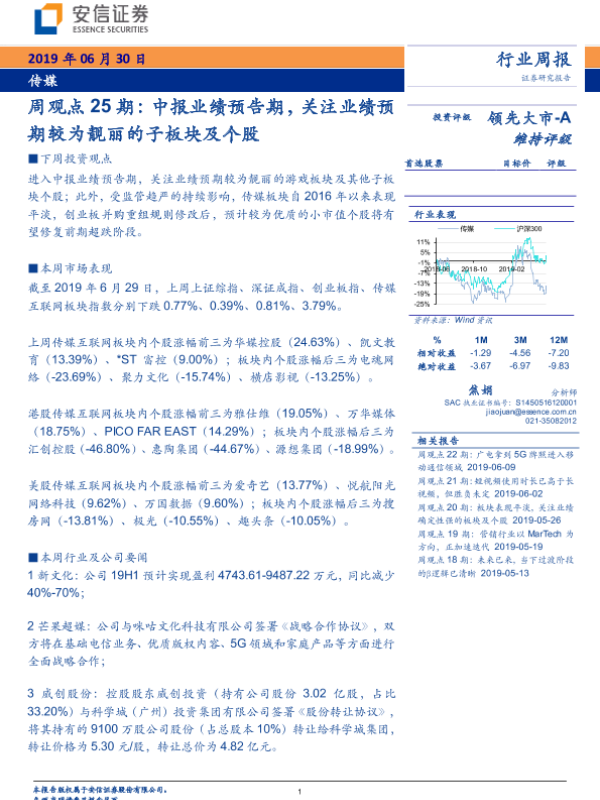 【安信证券】【20190630】20190630-安信证券-传媒周观点25期:中报业绩预告期,关注业绩预期较为靓丽的子板块及个股-21页