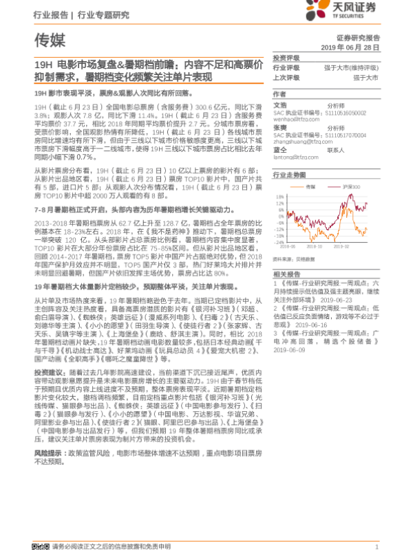 【天风证券】【20190628】19H电影市场复盘&暑期档前瞻:内容不足和高票价抑制需求,暑期档变化频繁关注单片表现-15页