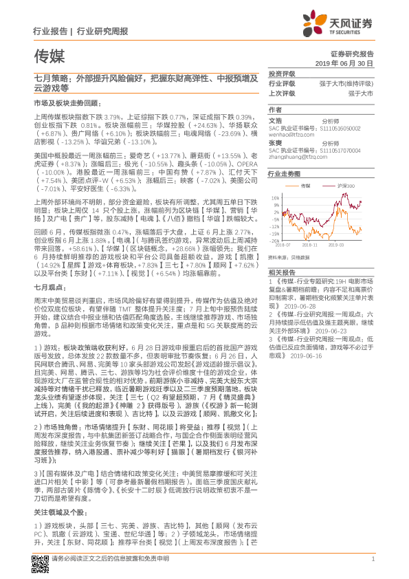 【天风证券】【20190630】传媒七月策略:外部提升风险偏好,把握东财高弹性、中报预增及云游戏等-24页