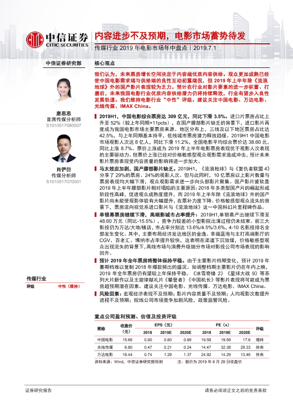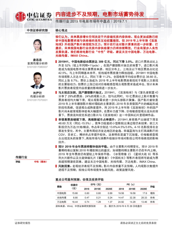 【中信证券】【20190701】传媒行业2019年电影市场年中盘点:内容进步不及预期,电影市场蓄势待发-10页