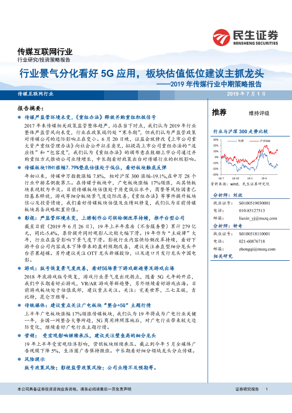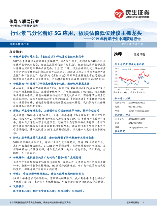 【民生证券】【20190701】2019年传媒行业中期策略报告:行业景气分化看好5G应用,板块估值低位建议主抓龙头-48页