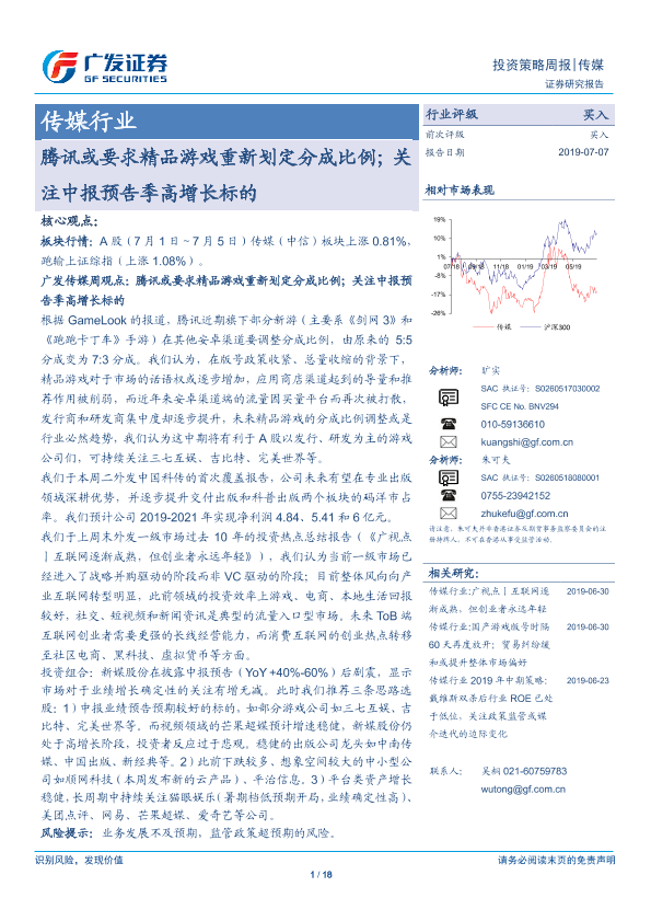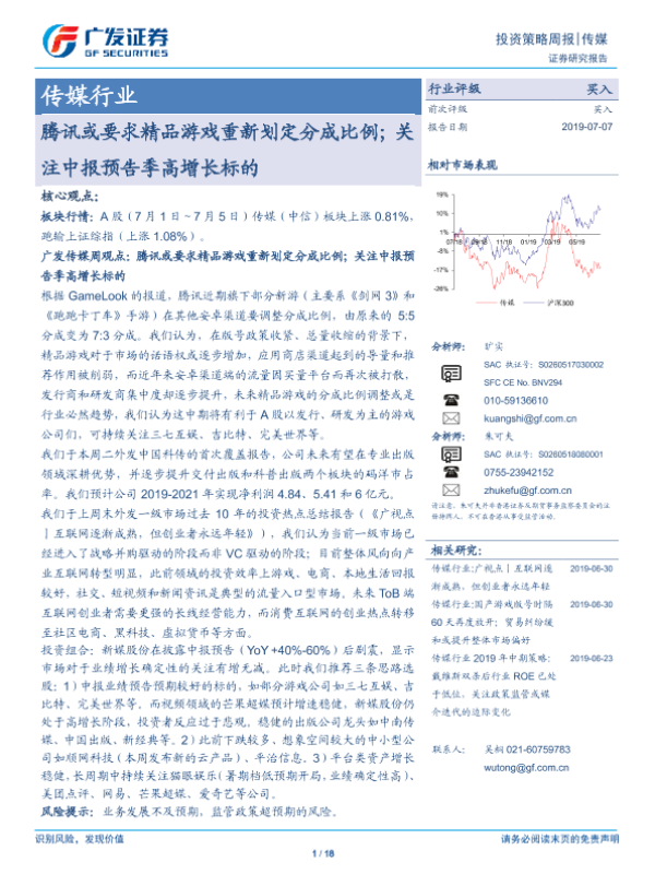 【广发证券】【20190707】20190707-广发证券-传媒行业投资策略周报:腾讯或要求精品游戏重新划定分成比例;注中报预告季高增长标的-18页
