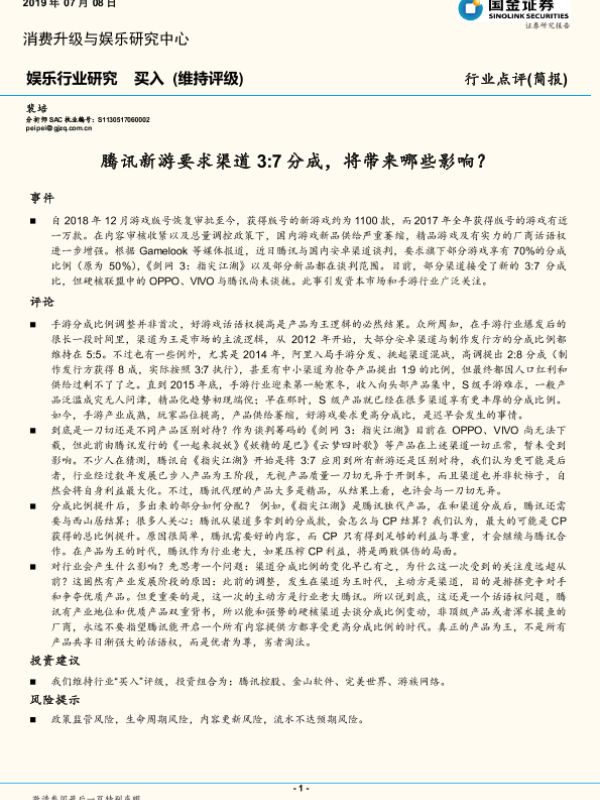 【国金证券】【20190708】腾讯新游要求渠道3 7分成,将带来哪些影响?-5页
