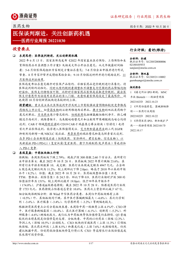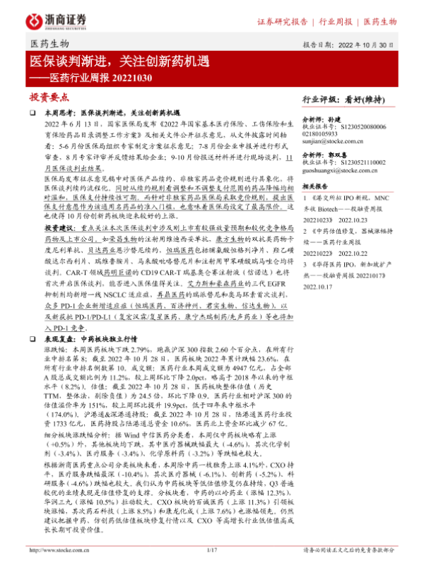【浙商证券】【20221030】医药行业周报:医保谈判渐进,关注创新药机遇-17页