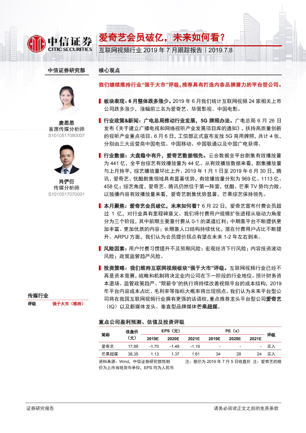 【中信证券】【20190708】互联网视频行业2019年7月跟踪报告:爱奇艺会员破亿,未来如何看?-11页
