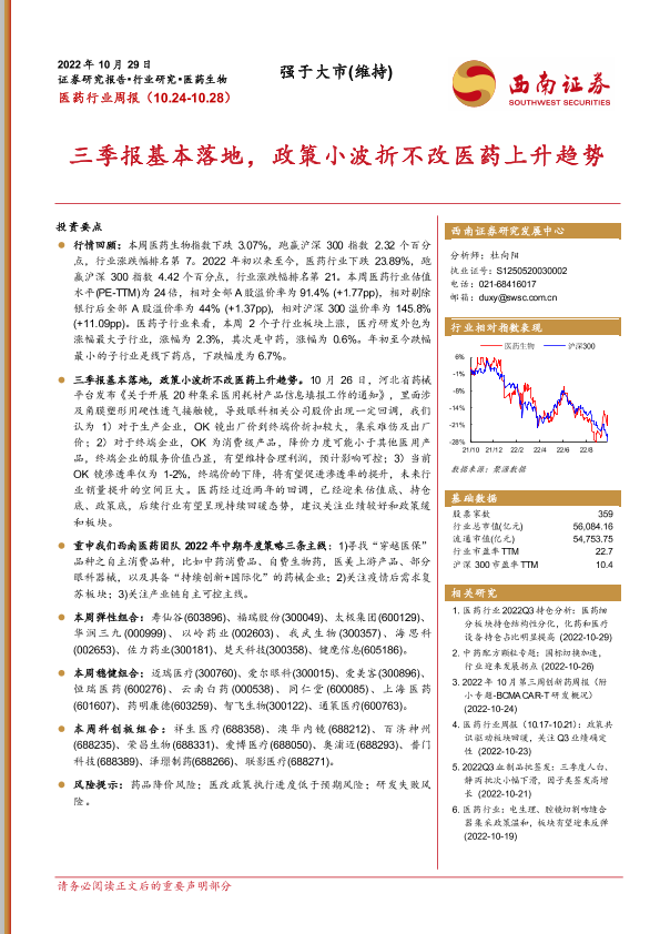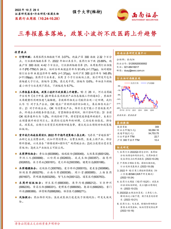 【西南证券】【20221029】医药行业周报:三季报基本落地,政策小波折不改医药上升趋势-39页