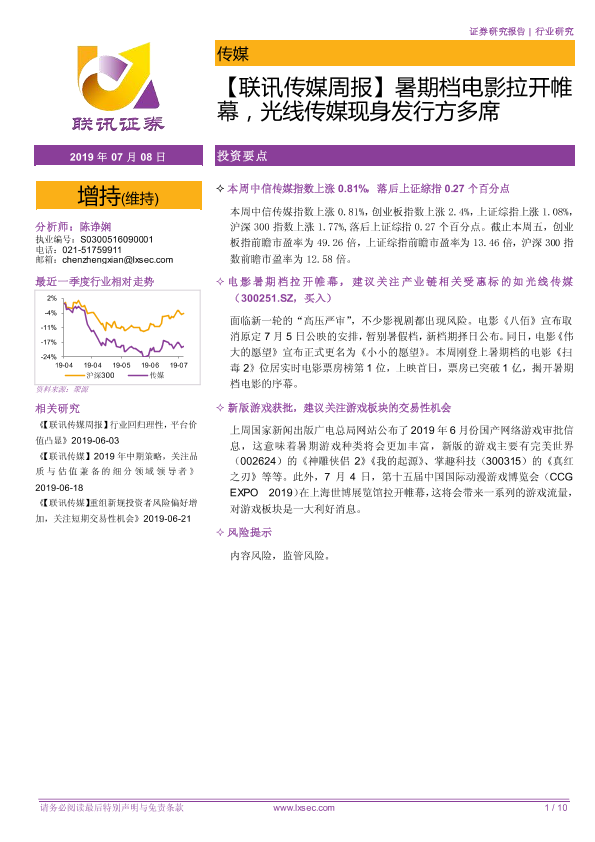 【粤开证券】【20190708】【联讯传媒周报】暑期档电影拉开帷幕,光线传媒现身发行方多席-10页