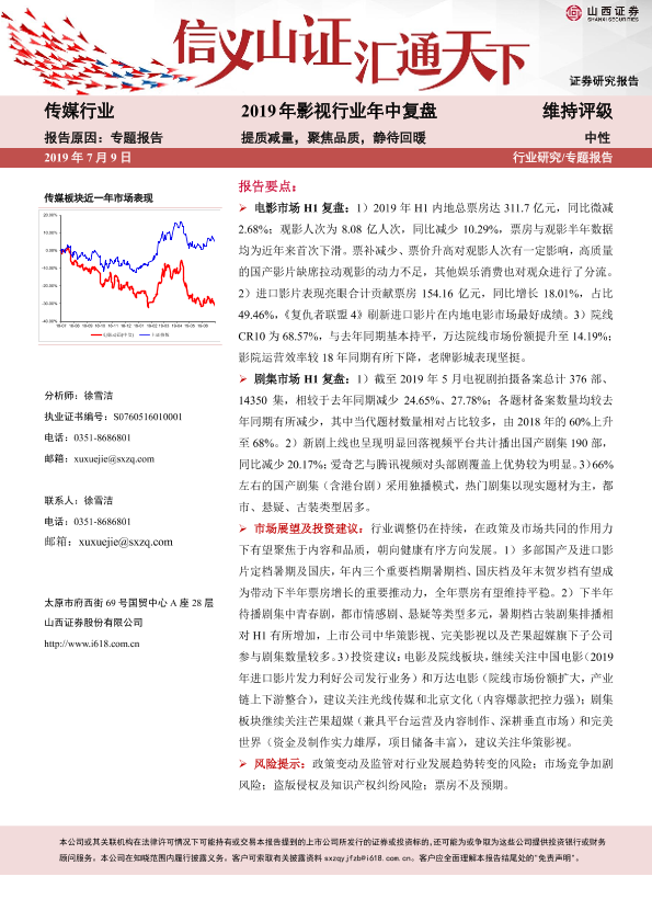【山西证券】【20190709】2019年影视行业年中复盘:提质减量,聚焦品质,静待回暖-18页