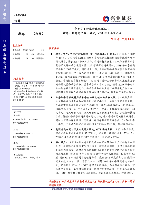 【兴业证券】【20190709】中美 OTT行业对比之 ROKU: 硬件、软件与平台一体化,打造 OTT龙头企业-31页
