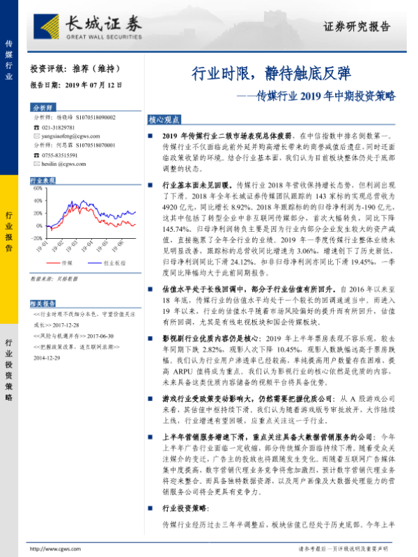 【长城证券】【20190712】传媒行业2019年中期投资策略:行业时限,静待触底反弹-22页