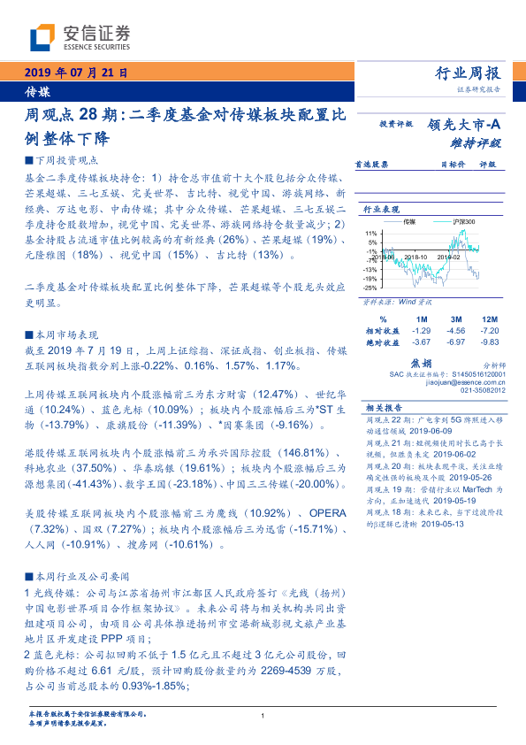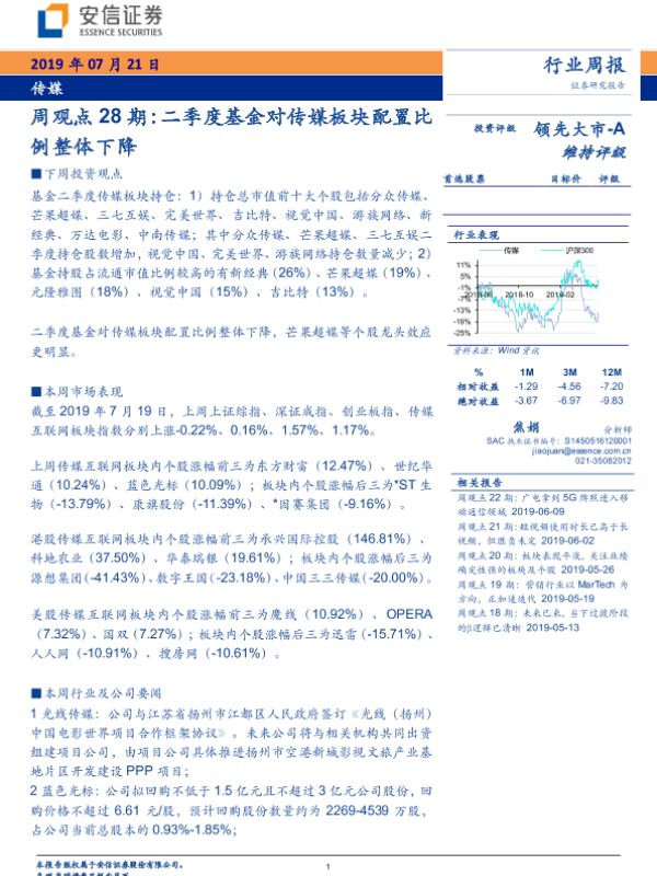 【安信证券】【20190714】20190714-安信证券-传媒周观点28期 :季度基金对传媒板块配置比例整体下降-19页