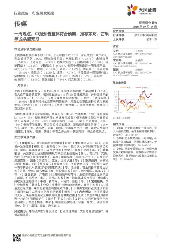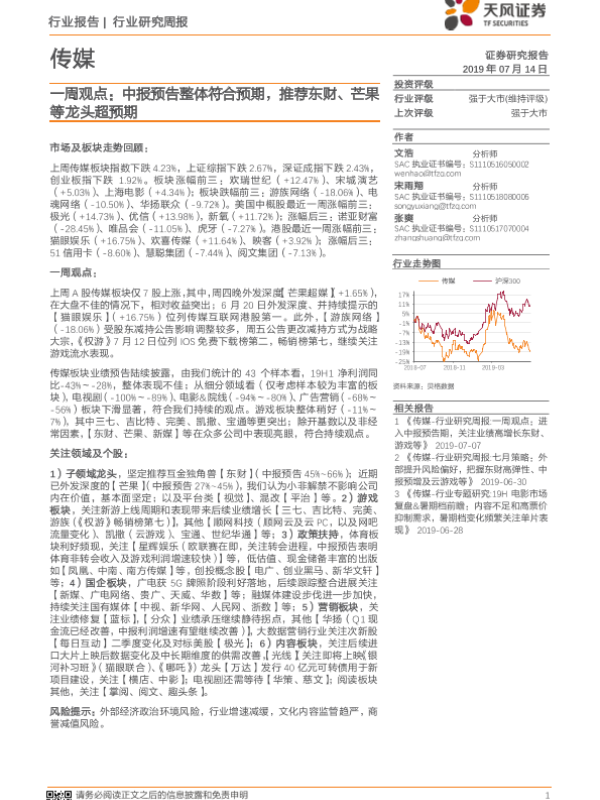 【天风证券】【20190714】传媒行业一周观点:中报预告整体符合预期,推荐东财、芒果等龙头超预期-27页