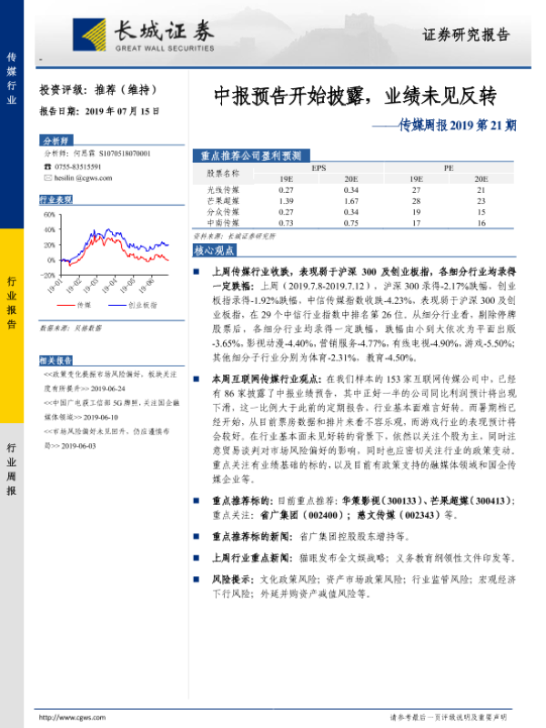 【长城证券】【20190715】20190715-长城证券-传媒周报2019第21期:中报预告开始披露,业绩未见反转-12页