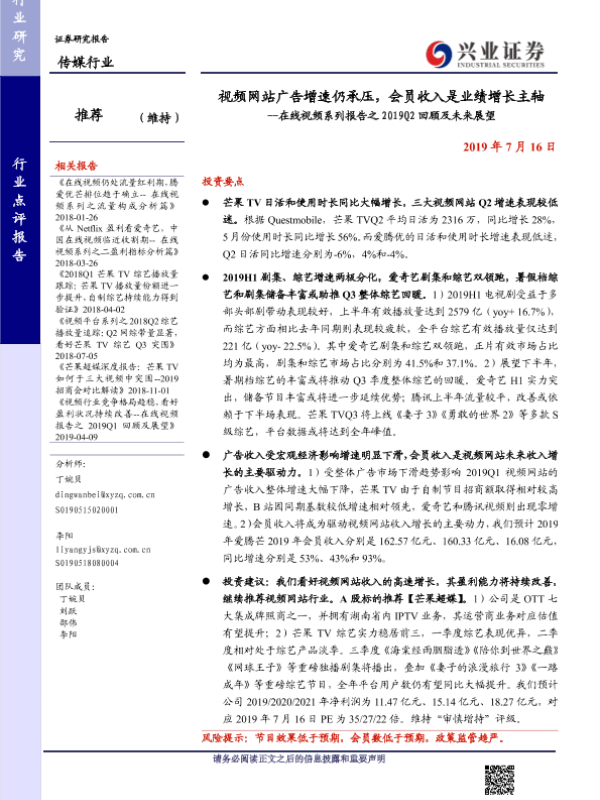【兴业证券】【20190716】视频网站广告增速仍承压,会员收入是业绩增长主轴--在线视频系列报告之2019Q2回顾及未来展望-22页