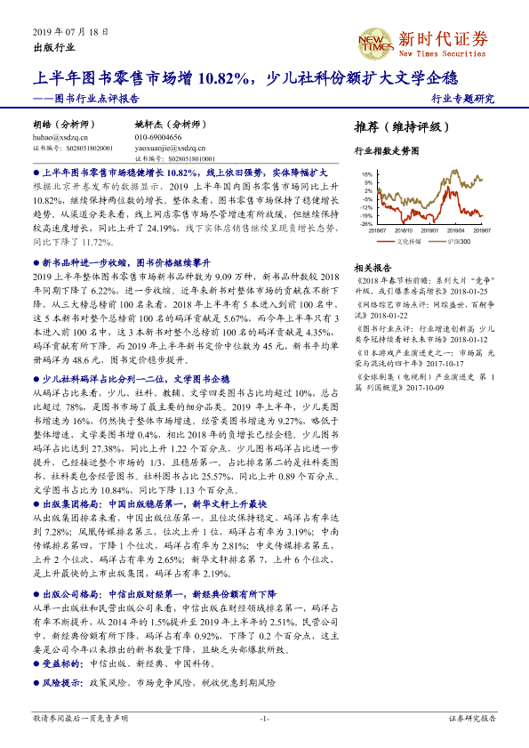 【新时代证券】【20190718】20190718-新时代证券-图书行业点评报告:上半年图书零售市场增10.82%,少儿社科份额扩大文学企稳-10页