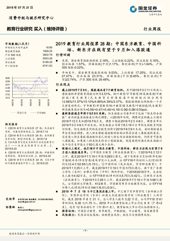 【国金证券】【20190721】2019教育行业周报第28期:中国东方教育、中国科培、新东方在线有望于9月加入港股通-7页