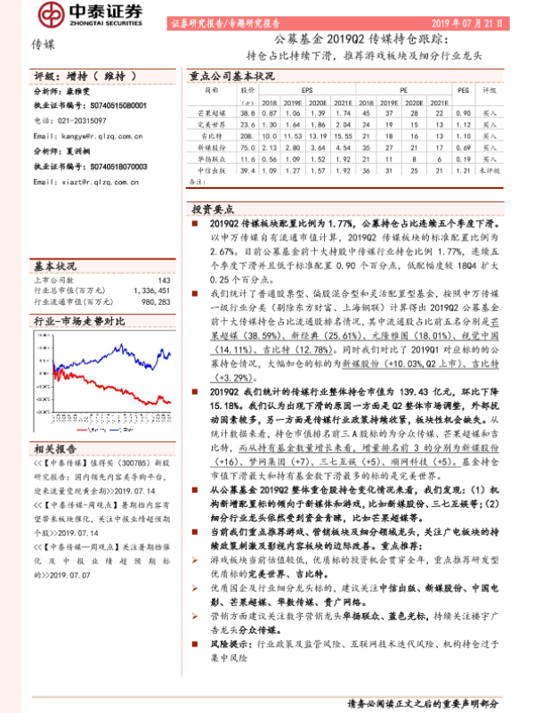 【中泰证券】【20190721】公募基金2019Q2传媒持仓跟踪:持仓占比持续下滑,推荐游戏板块及细分行业龙头-7页