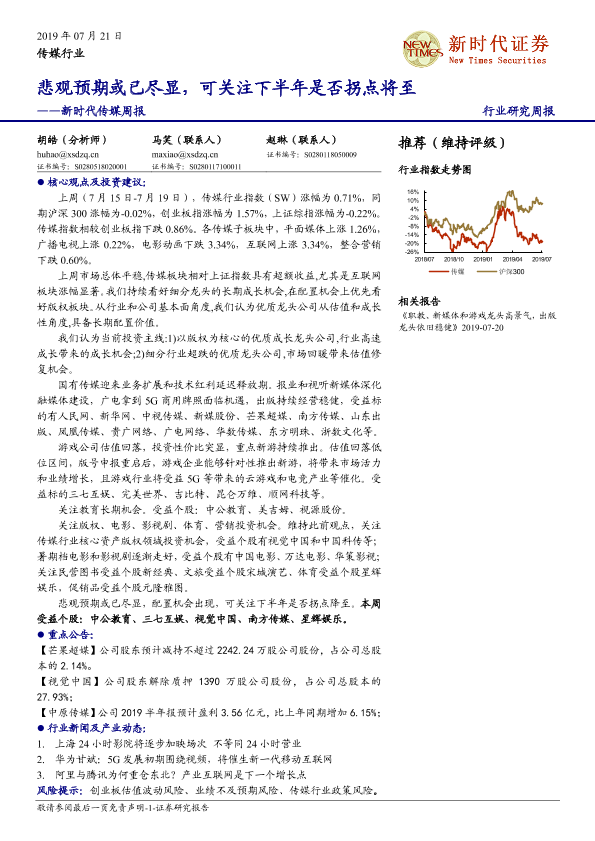 【新时代证券】【20190721】新时代传媒周报:悲观预期或已尽显,可关注下半年是否拐点将至-13页