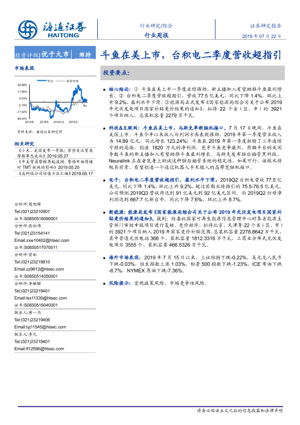 【海通证券】【20190722】20190722-海通证券-综合行业周报:斗鱼在美上市,台积电二季度营收超指引-7页